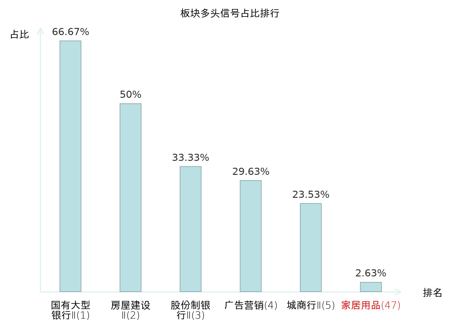 全市场所有行业板块中主力多头信号占比排名中,国有大型银行Ⅱ板块位居第一。国有大型银行Ⅱ板块名次提升最快,较昨日上升122位。