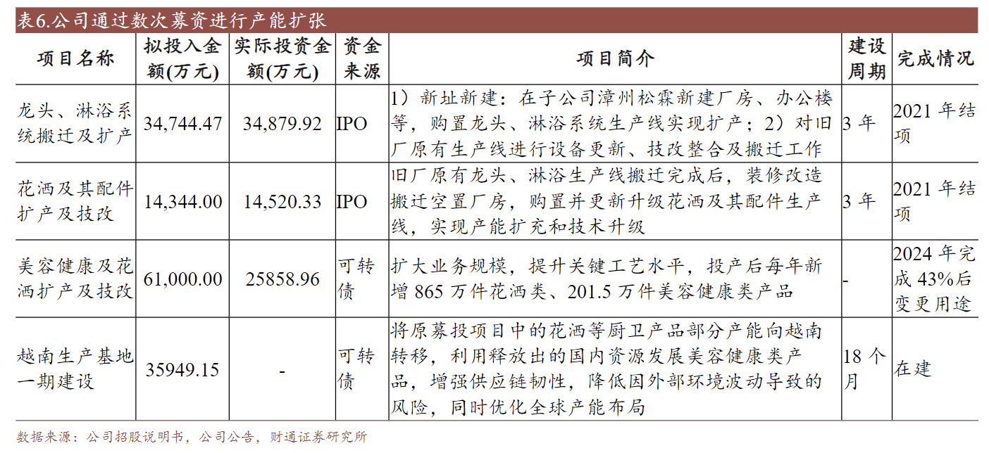 坚持产能优化,募资切合发展路径。公司拥有厦门海沧区和漳州长泰区两大生产基地,越南基地在建。20228月,公司发行可转债募集资金6.1亿元,用于美容健康及花洒扩产及技改项目,达产后公司每年将新增865万件花洒类、201.5万件美容健康类产品,产能得到大幅提升。