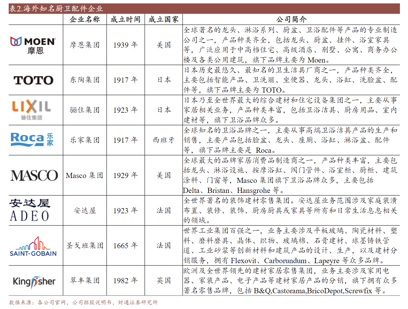 我国厨卫市场中,海外品牌占领先发优势,技术实力雄厚。全球知名厨卫品牌商主要集中在起步较早,发展较为成熟,管理和技术水平较为先进的美国、欧洲、日本等发达国家或地区。20世纪80年代,美标、摩恩、科勒、TOTO等外资品牌进入中国,锁定沿海开放城市,凭借品牌和技术优势占领国内高端厨卫配件市场,直切高档宾馆、写字楼、高档住宅,经历了高利润回报率的黄金时期,率先打开国内市场,奠定先发优势。
