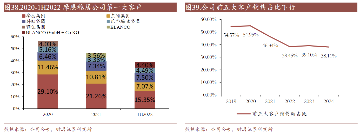 厨卫业务有望稳步开拓,主要系公司绑定优质客户,客户覆盖面越发广泛。公司下游客户主要包括1)国际知名高端品牌商,家居厨卫领域包括例如Moen(美国摩恩)、TOTO(日本东陶)、Grohe(德国高仪)、Roca(西班牙乐家)、Kohler(美国科勒)、Waterpik(美国洁碧)等;2)国际大型连锁建材零售商,如ADEO(法国安达屋)。摩恩集团、东陶集团和科勒集团稳居公司前五大客户内,前五大客户集中度由2019年的54.57%降至2024年的38.11%,下游客户覆盖范围持续拓宽。