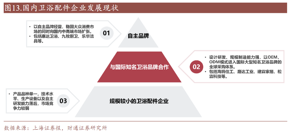 国内厨卫配件品牌发展相对缓慢,近年来通过持续研发投入,不断扩大生产制造规模。本土厨卫品牌21世纪初开始高速增长,部分民族厨卫品牌开始竞争中、高端市场,外资品牌与本土品牌市场愈发重叠。当前,国内厨卫配件企业可分为三类: