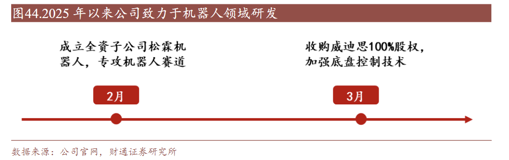 设立子公司、收购威迪思,开启机器人新篇章。20252月公司成立全资子公司松霖机器人,3月底公司收购威迪思100%股权。威迪思聚焦商用车底盘控制研发,可与公司实现技术协同。公司的IDM技术支持全产业链,在夯实底层制造优势的同时加强技术研发,实现技术闭环,威迪思的底盘、控制工程化能力与公司的健康算法、精密制造形成互补,加速机器人产品落地。
