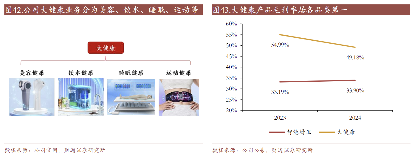 厨卫为本,大健康快速发展。公司成立于2004年,并于2019年上市,公司坚持健康硬件IDM的创新驱动发展战略,稳步推进厨卫代工业务。2024年智能厨卫营收25.32亿元同降1.63%,占公司总营收84%