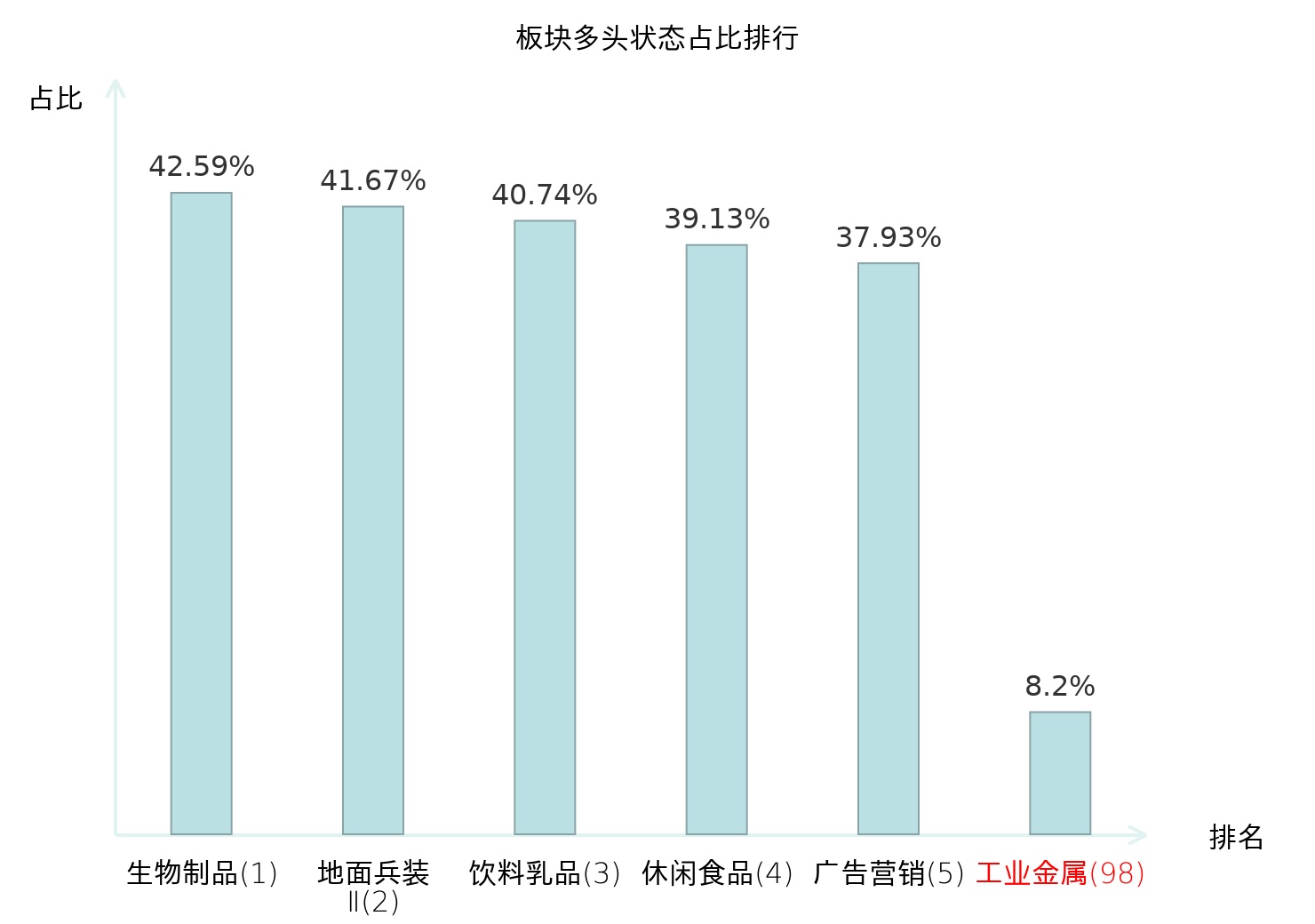 全市场所有行业板块中主力多头状态占比排名中,生物制品板块位居第一。黑色家电板块名次提升最快,较昨日上升65位。