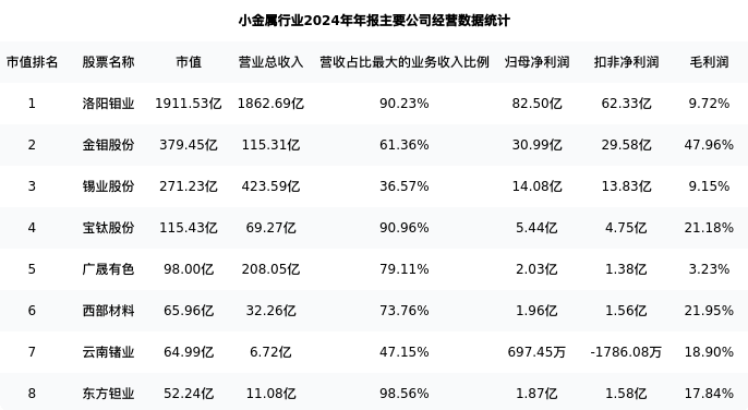 洛阳钼业最新报告期数据为年报,下表汇总了小金属行业内市值靠前的公司年报主要经营数据