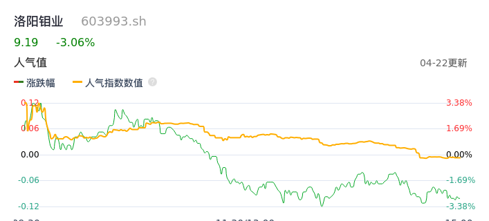 04月22日,洛阳钼业收报9.19,股价涨幅-3.06%,成交金额22.42亿元,换手率1.34%。