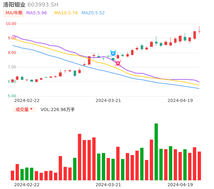 值得注意的是:2024年04月国元证券的马捷分析师,首次发布关于洛阳钼业的研究报告,标题为:洛阳钼业(603993)首次覆盖报告:“矿山+贸易”结合 打造全球一流矿业公司。