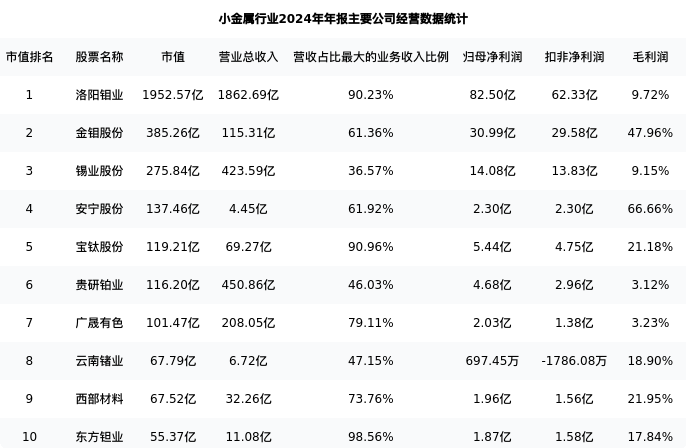洛阳钼业最新报告期数据为年报,下表汇总了小金属行业内市值靠前的公司年报主要经营数据