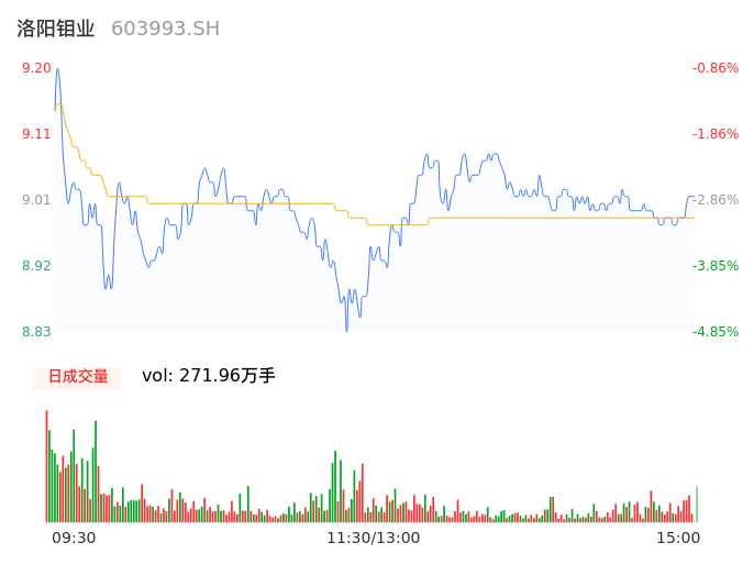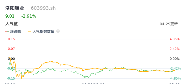 04月29日,洛阳钼业收报9.01,股价涨幅-2.91%,成交金额24.45亿元,换手率1.54%。