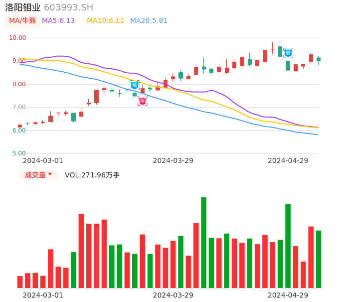 值得注意的是:2024年04月中原证券的李泽森分析师,首次发布关于洛阳钼业的研究报告,标题为:洛阳钼业(603993):经营业绩创新高 新能源金属布局更加完善。