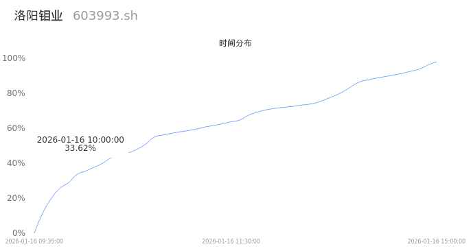603993洛阳钼业2026年01月16日成交330.42万手,成交金额81.24亿,相较昨日放量24.83万手,换手率1.89%,成交清淡。