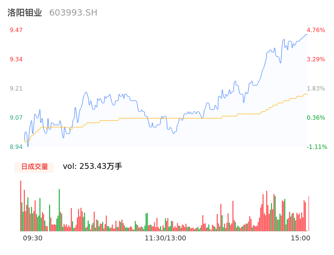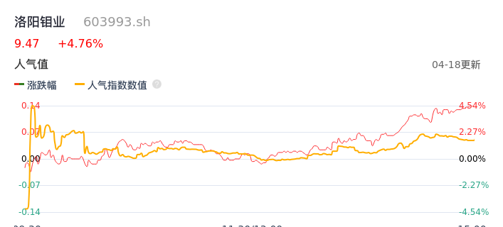 04月18日,洛阳钼业收报9.47,股价涨幅4.76%,成交金额23.31亿元,换手率1.44%。