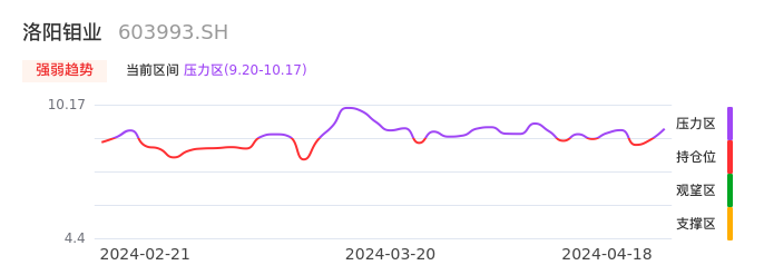 我们来看一下该股的九方特色指标强弱趋势的情况:洛阳钼业近日从持仓区进入压力区。股价出现一波快速拉升行情,目前上升动能较为充足可继续持股。注意今日上方压力位:10.17元是否能有效突破。
