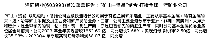 值得注意的是:2024年04月国元证券的马捷分析师,首次发布关于洛阳钼业的研究报告,标题为:洛阳钼业(603993)首次覆盖报告:“矿山+贸易”结合 打造全球一流矿业公司。