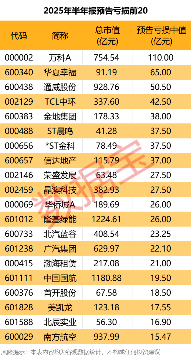 同时,也有部分上市公司预计2025年上半年亏损。万科A、华夏幸福、通威股份亏损金额排名前三,分别为110亿元、65亿元、50.5亿元。