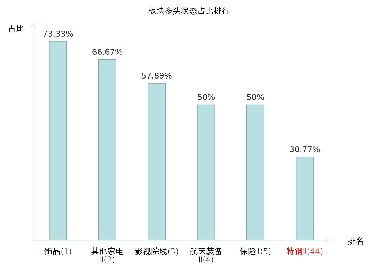 全市场所有行业板块中主力多头状态占比排名中,饰品板块位居第一。航天装备Ⅱ板块名次提升最快,较昨日上升109位。