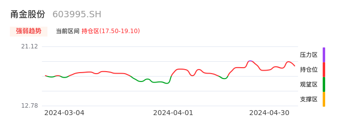 我们来看一下该股的九方特色指标强弱趋势的情况:甬金股份自04月22日从压力区回到持仓区。股价近期持续调整。后续重点关注能否站稳多空分界点:17.50元。如被有效击穿则将进入空头行情。