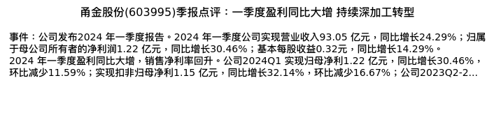 值得注意的是:2024年04月国盛证券的笃慧/高亢分析师,首次发布关于甬金股份的研究报告,标题为:甬金股份(603995)季报点评:一季度盈利同比大增 持续深加工转型。