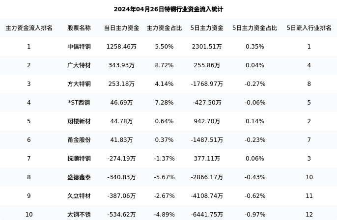 从主力资金流向来看,特钢行业今日主力资金流入3.58亿元,在所有申万二级行业中排名:66/131。