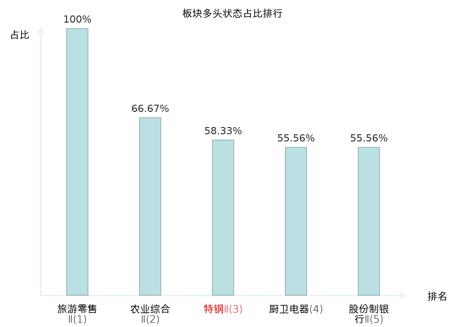 全市场所有行业板块中主力多头状态占比排名中,旅游零售Ⅱ板块位居第一。农业综合Ⅱ板块名次提升最快,较昨日上升127位。