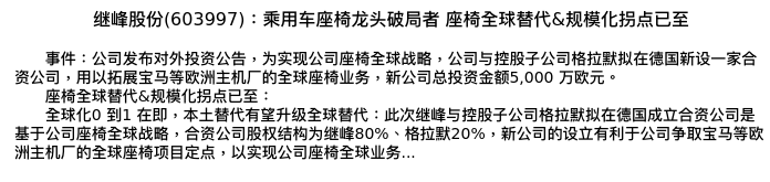 值得注意的是:2024年04月中泰证券的何俊艺/刘欣畅分析师,首次发布关于继峰股份的研究报告,标题为:继峰股份(603997):乘用车座椅龙头破局者 座椅全球替代&规模化拐点已至。
