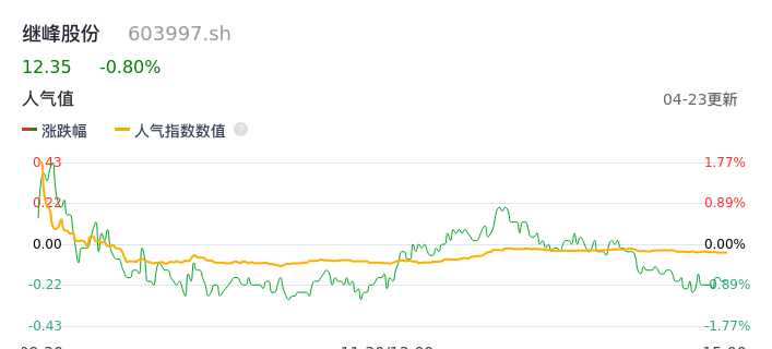 04月23日,继峰股份收报12.35,股价涨幅-0.80%,成交金额4476.67万元,换手率0.31%。