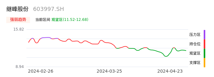 我们来看一下该股的九方特色指标强弱趋势的情况:继峰股份近日从持仓区下穿到观望区,股价出现持续性调整行情。短期已经转为空头行情,且下跌动能仍未衰竭。建议继续谨慎观望。