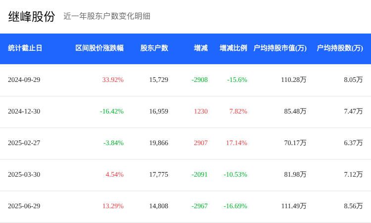 截至2025年6月30日,继峰股份(603997)的股东户数为1.48万户,较上期减少了16.69%。户均持股数量上升至20.22股,户均持股市值达到111.49万元,环比增长35.99%。这些变化显示,股东集中度有所提高,大额持股的股东比例增加。
