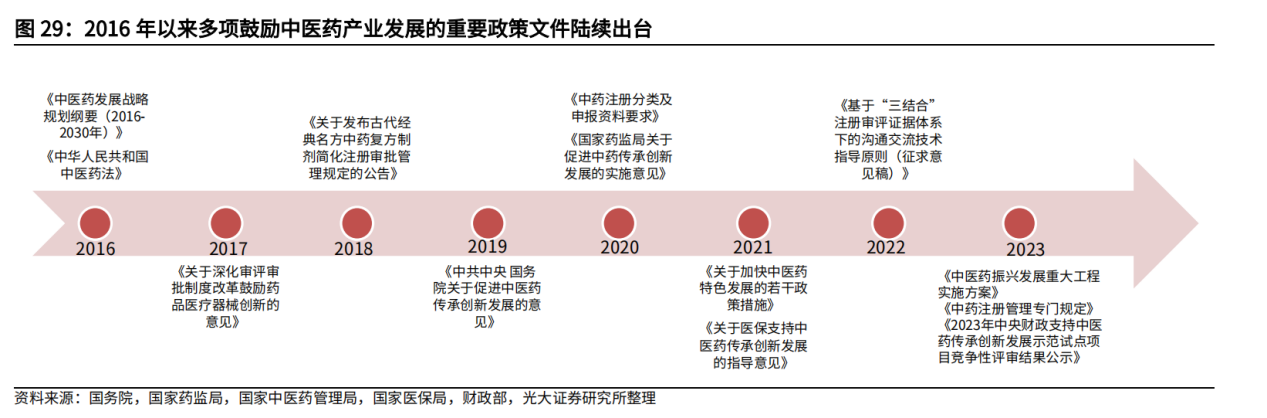 短期来看,国家中医药振兴发展政策从医疗服务体系、中西医协同、产业创新和现代化、人才培养、中药质量提升等领域全面展开,政策和商业环境友好,中药注册管理和临床评价体系的重塑和申报单列将推动新药加速研发和上市。