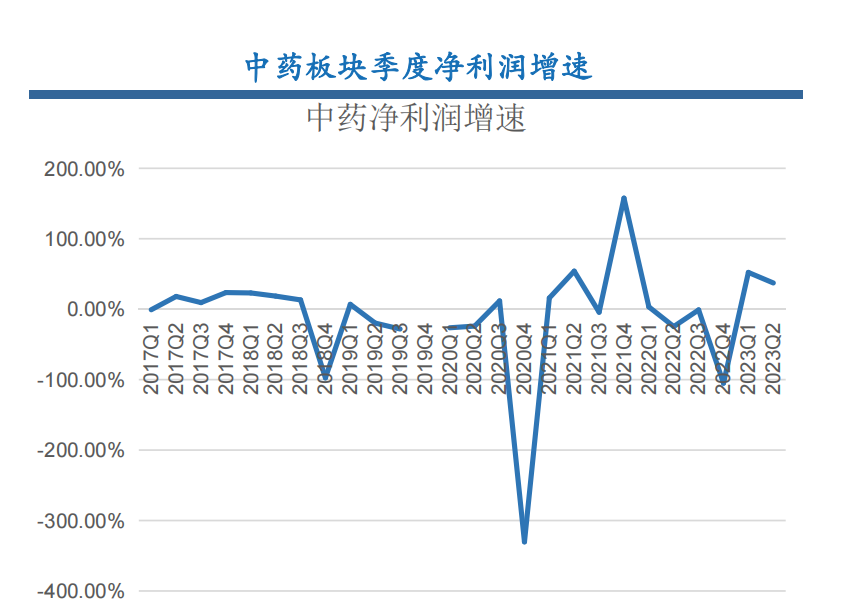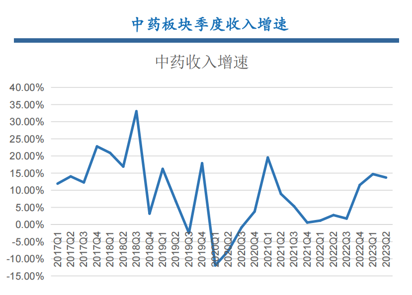 中药板块2017年以来的收入和利润增速。近4季度,板块收入增速逐季提升,22Q3、22Q4、23Q1、23Q2收入增速分别为1.74%、11.52%、14.71%、13.71%。