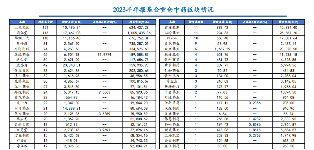 根据最新的2023年基金半年报数据统计,共计46家中药公司获得公募基金重仓持有,与2023Q1相比减少了1家公司;每家公司平均持股3037万股,相较2023Q1减少了3.75%;平均持股市值为10.74亿元,相较2023Q1增加2.24%。