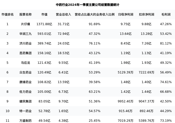 方盛制药最新报告期数据为一季度,下表汇总了中药行业内市值靠前的公司一季度主要经营数据