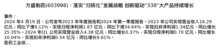 值得注意的是:2024年04月国投证券的马帅/贺鑫分析师,首次发布关于方盛制药的研究报告,标题为:方盛制药(603998):落实“归核化”发展战略 创新驱动“338”大产品持续增长。