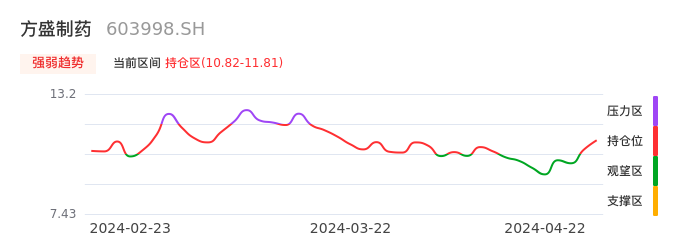 我们来看一下该股的九方特色指标强弱趋势的情况:方盛制药近日从观望区上穿到持仓区。股价短期站稳多头区域,上升动能仍较为充足,可积极关注。后续重点关注上方压力位:11.81元是否能突破上攻。