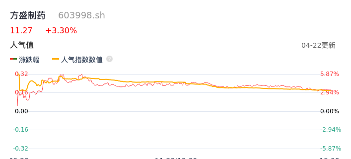 04月22日,方盛制药收报11.27,股价涨幅3.30%,成交金额1.50亿元,换手率3.05%。