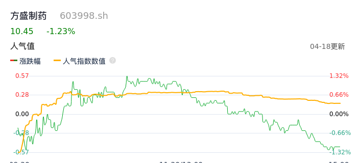 04月18日,方盛制药收报10.45,股价涨幅-1.23%,成交金额3431.64万元,换手率0.75%。