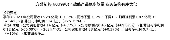 值得注意的是:2024年04月东吴证券的朱国广分析师,首次发布关于方盛制药的研究报告,标题为:方盛制药(603998):战略产品稳步放量 业务结构有序优化。