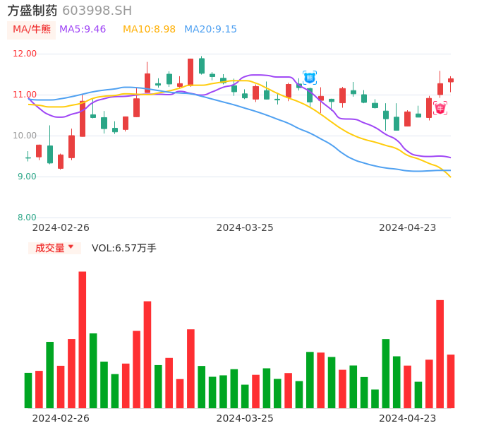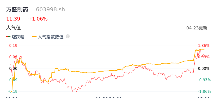 04月23日,方盛制药收报11.39,股价涨幅1.06%,成交金额7403.13万元,换手率1.51%。