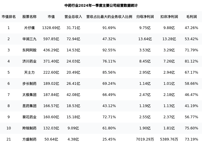 方盛制药最新报告期数据为一季度,下表汇总了中药行业内市值靠前的公司一季度主要经营数据