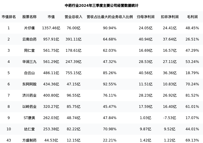 方盛制药最新报告期数据为三季度,下表汇总了中药行业内市值靠前的公司三季度主要经营数据