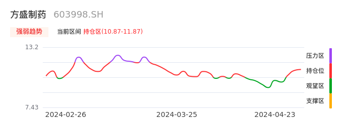 我们来看一下该股的九方特色指标强弱趋势的情况:方盛制药近日从观望区上穿到持仓区。股价短期站稳多头区域,上升动能仍较为充足,可积极关注。后续重点关注上方压力位:11.87元是否能突破上攻。