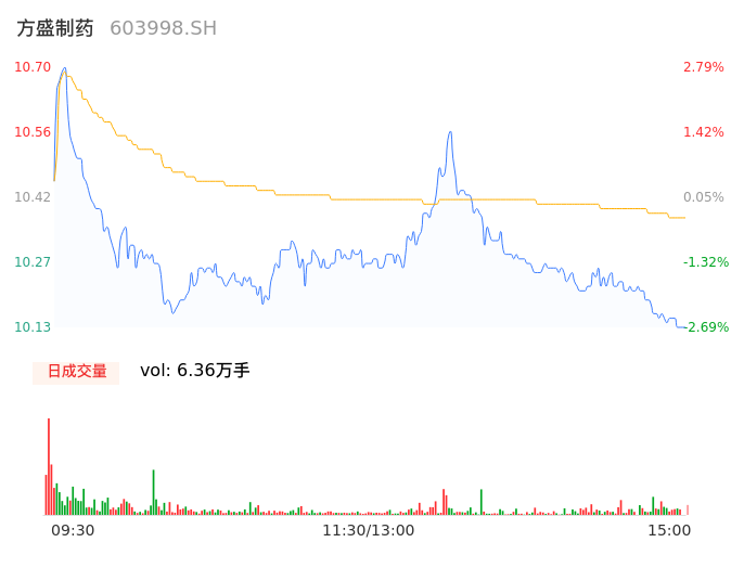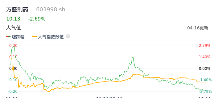 04月16日,方盛制药收报10.13,股价涨幅-2.69%,成交金额6594.12万元,换手率1.46%。