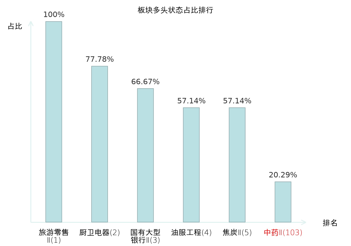 全市场所有行业板块中主力多头状态占比排名中,旅游零售Ⅱ板块位居第一。房地产服务板块名次提升最快,较昨日上升71位。