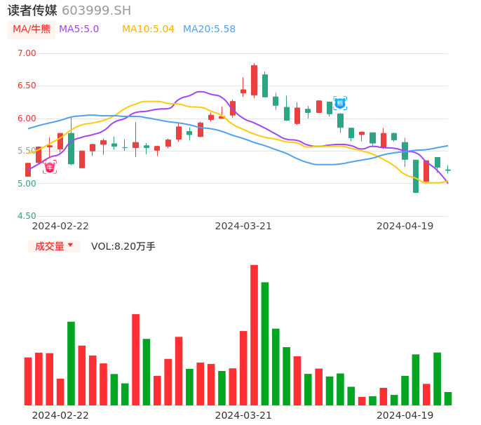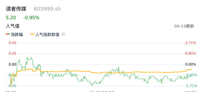 04月19日,读者传媒收报5.20,股价涨幅-0.95%,成交金额4270.90万元,换手率1.42%。