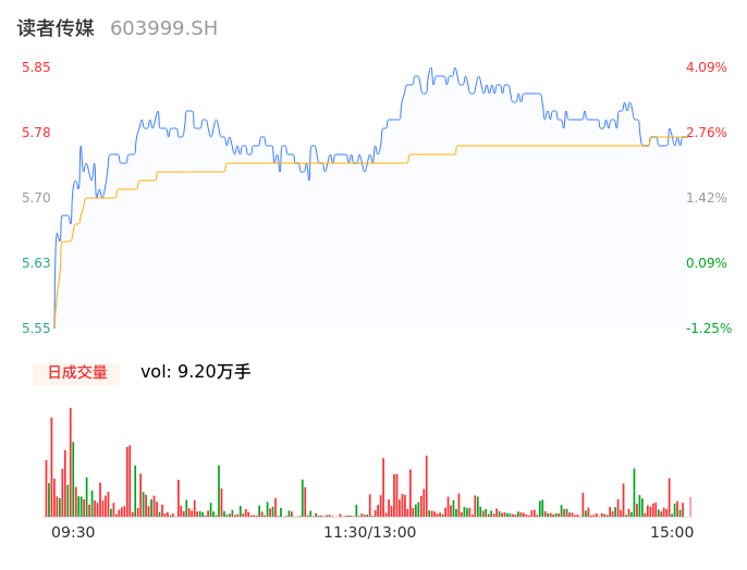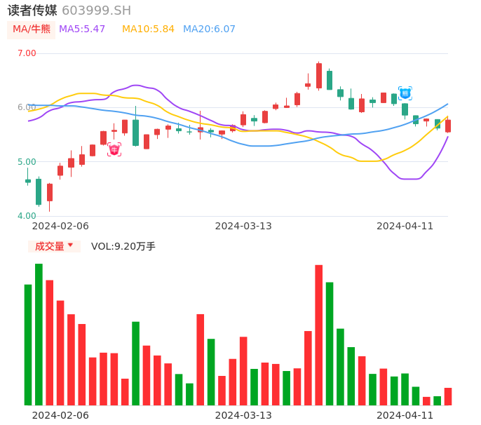 04月11日,读者传媒收报5.77,股价涨幅2.67%,成交金额5305.44万元,换手率1.60%。