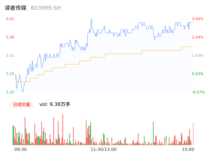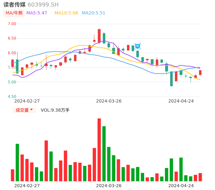 04月24日,读者传媒收报5.40,股价涨幅3.25%,成交金额4997.47万元,换手率1.63%。