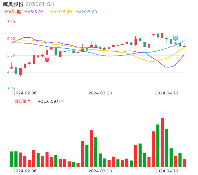 04月11日,威奥股份收报5.57,股价涨幅0.36%,成交金额3690.16万元,换手率1.68%。