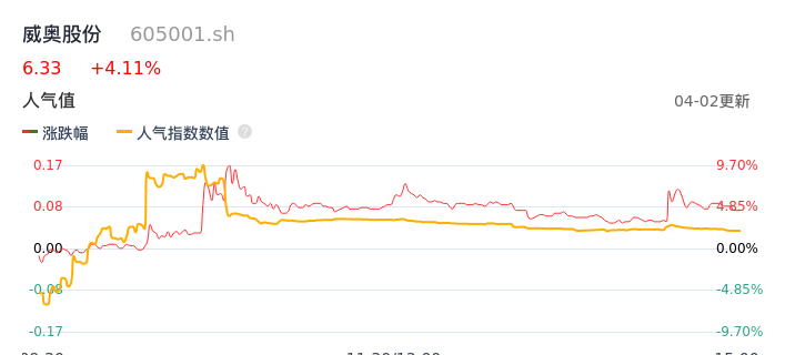 04月02日,威奥股份收报6.33,股价涨幅4.11%,成交金额2.60亿元,换手率10.41%。