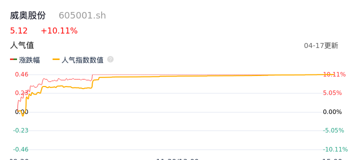 04月17日,威奥股份收报5.12,股价涨幅10.11%,成交金额4532.91万元,换手率2.30%。