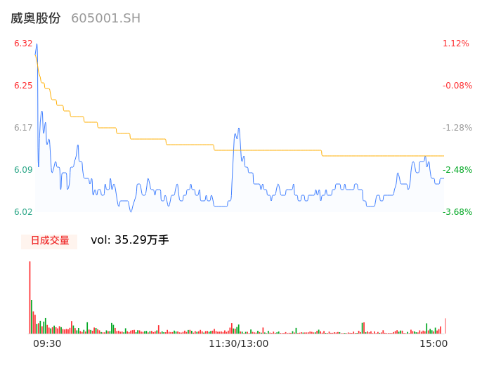 04月01日,威奥股份收报6.08,股价涨幅-2.72%,成交金额2.16亿元,换手率8.98%。